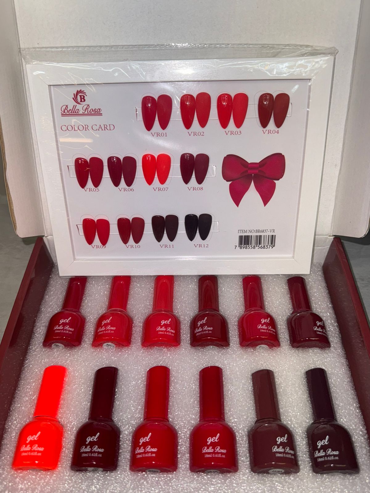 12 Esmaltes em Gel Premium: Cada frasco traz uma tonalidade única, identificada de VR01 a VR12, variando entre vermelhos vibrantes e vinhos profundos.