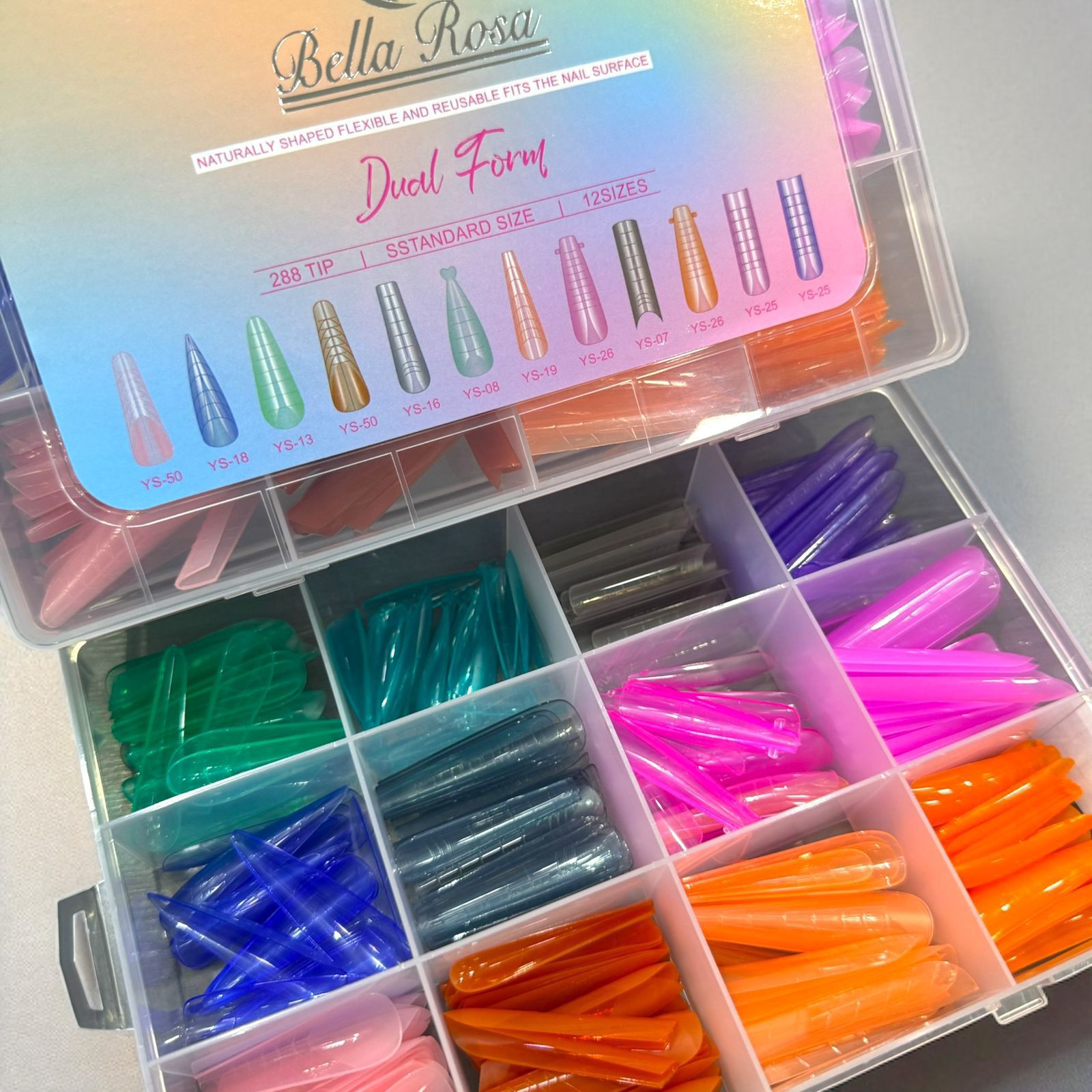 um kit contendo 288 unhas postiças coloridas divididas em 12 moldes diferentes.